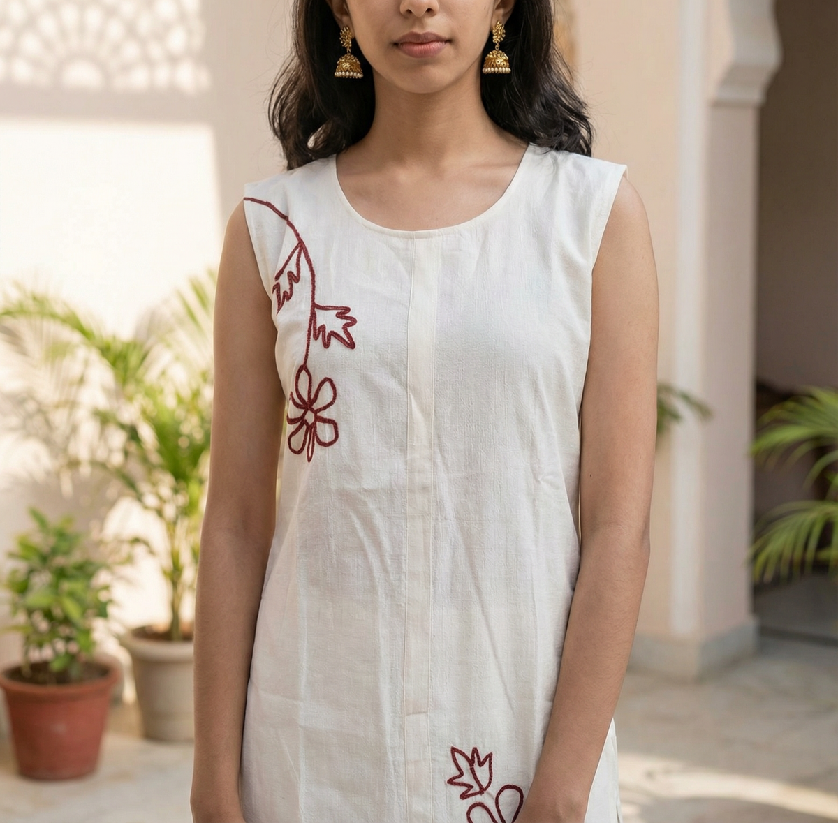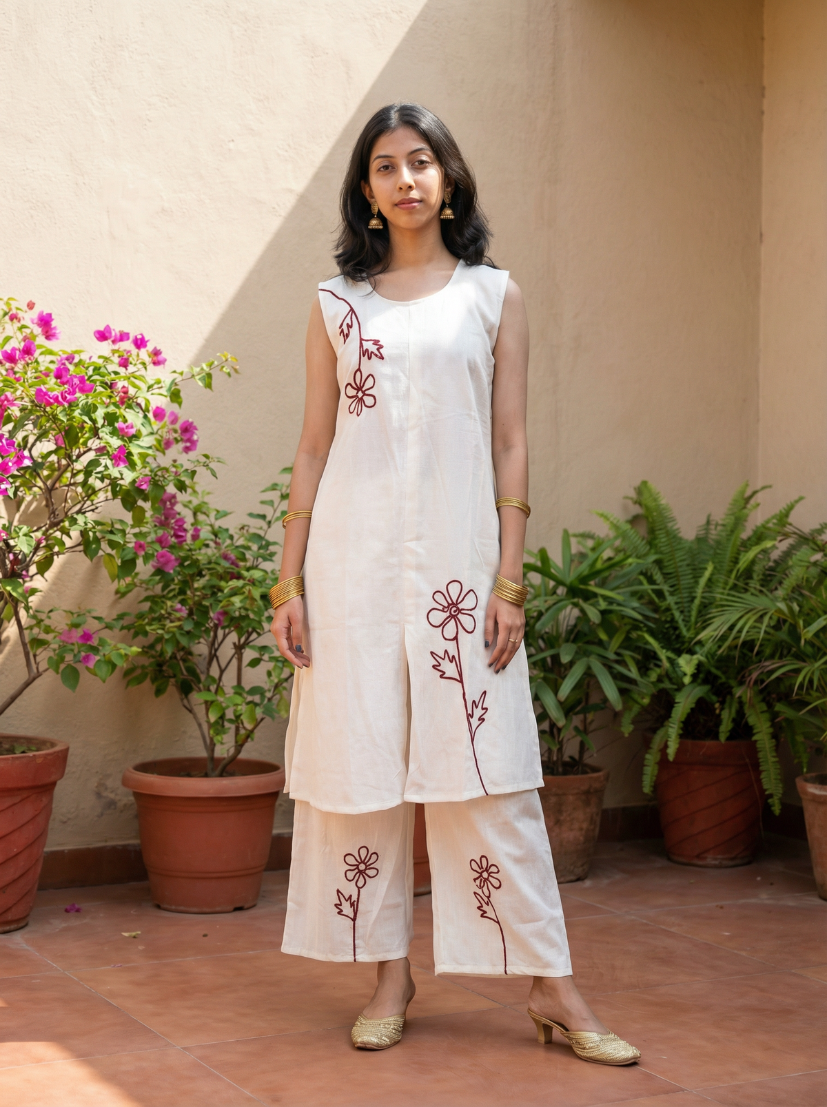 VATICAN SILK WHITE CORD SET WITH BEAUTIFUL FLOWER EMBROIDERY - M